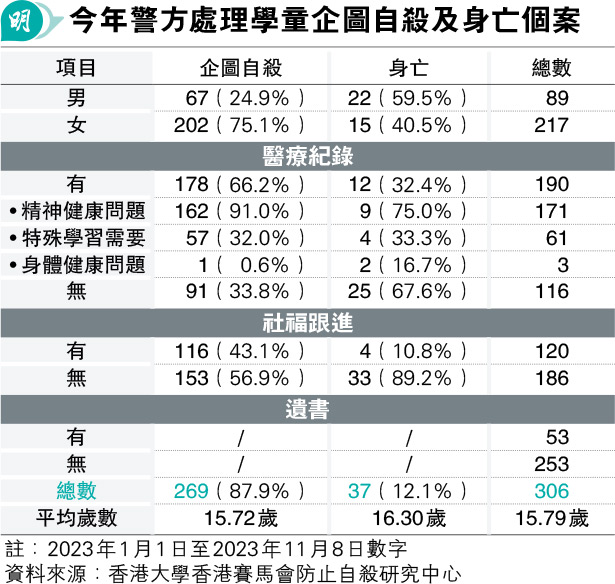 警方昨舉辦「港島總區校園危機處理及預防學生自殺分享會」,籲教育界及社福界重視學童輕生問題。港大防止自殺研究中心會上引述警方數字,指今年截至上周三(8日)已有306名學童輕生,其中269人獲救、37人死亡(見表),平均年齡15.8歲。輕生學童中有約62%具醫療紀錄,主要包括精神健康問題、特殊學習需要及身體健康問題等。個案中有約39%人事前獲社福跟進。