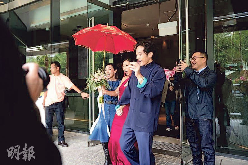 林德信分享的婚禮照片中,未見雙方家長,亦未有Candace的正面相,其中一張是接完新娘後兩人步出大廈,他們手牽手剛好遮着Candace的腹部;另一張相,一對新人在海邊擁吻,Candace將手放在腹部。