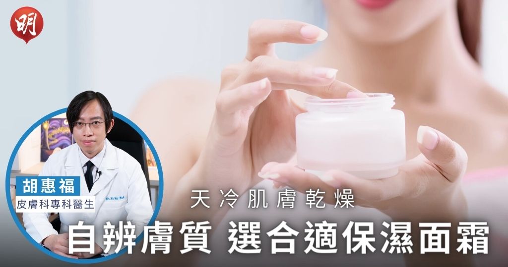 天氣轉涼,相對濕度低,肌膚容易乾燥,不少人會選用保濕面霜滋潤皮膚。皮膚科專科醫生胡惠福接受明報電子平台組訪問表示,乾燥天氣會令皮膚水分加快流失,保濕面霜有助補充天然油分及濕潤皮膚,鎖起水分,恢復表皮屏障保護功能,減輕皮膚乾燥痕癢感。胡惠福講解如何自行辨別膚質,並提醒大眾應按照膚質和天氣選購合適保濕面霜。
