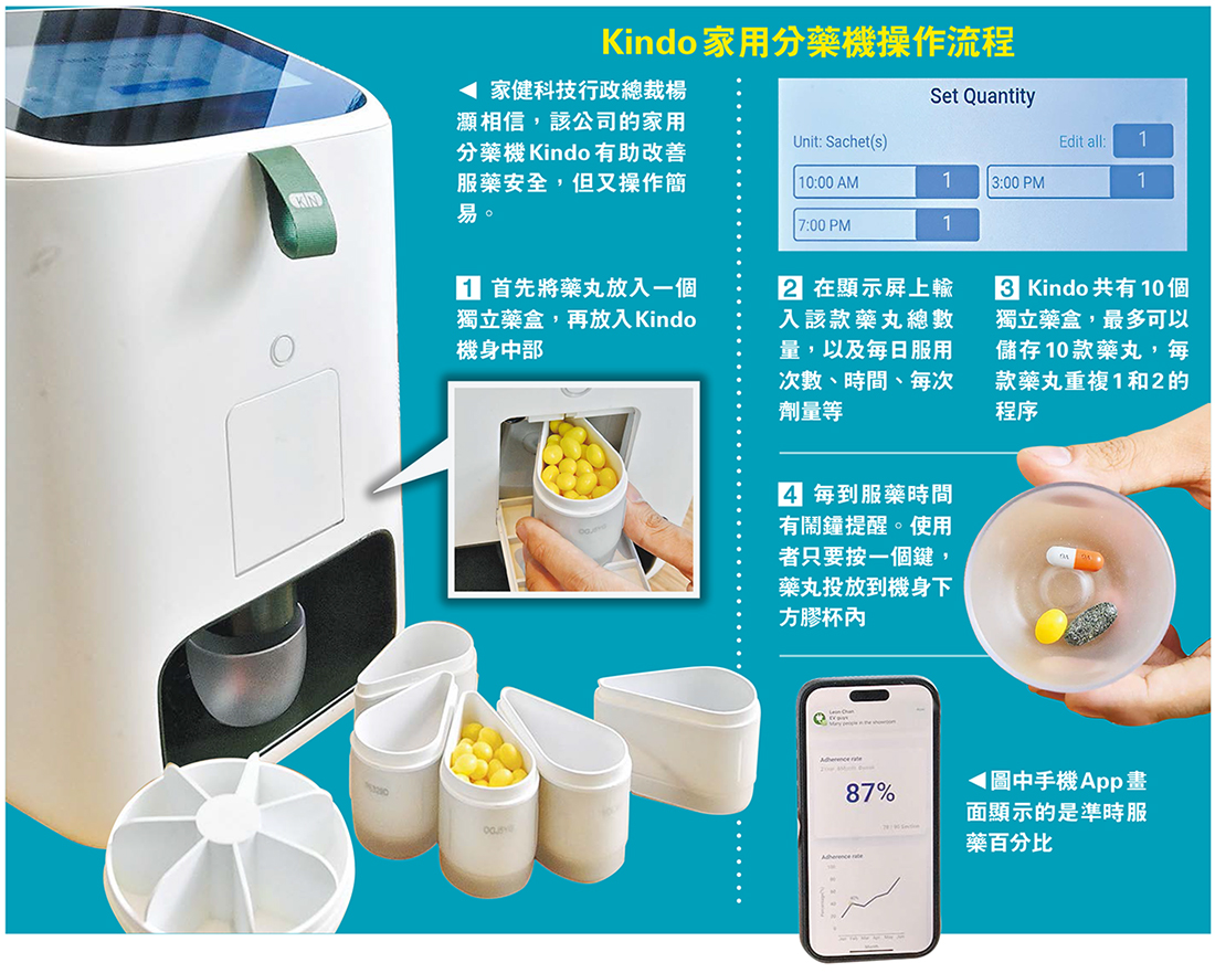 家健科技有限公司(Kin Technology)行政總裁楊灦表示,公司成立於2018年底,2019年初開始研製稱為Kindo的家用分藥機,目標是改善服藥安全和提高管理效率,而且操作簡易,有「一鍵服藥」效果,以減輕長者或長期病患者的照顧者負擔。