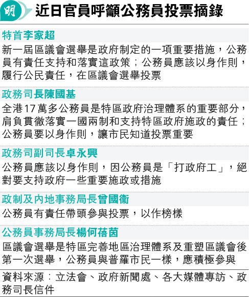 【明報專訊】繼多名政府官員呼籲公務員在今屆區議會選舉投票(見表),特首李家超昨日亦表示,公務員肩負落實和支持特區政府施政的責任,有責任支持和落實政府所推動的新一屆區議會選舉,同時應以身作則,履行公民責任,在區選投票。本報向公務員事務局查詢局方會否有機制要求監察公務員投票,以履行其支持政府施政的責任,或會否就投票設立賞罰機制,局方回覆稱特首已說明有關事宜,故沒有補充,惟翻查李家超昨日的發言,並未就以上問題作任何說明。明報記者