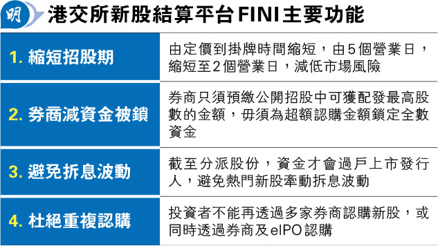 【明報專訊】港交所新股結算平台FINI今日(22日)正式推出,新股從定價至掛牌的時間由5個營業日(T+5)縮短至2個營業日(T+2)。多家活躍新股市場的券商均表示,FINI推出後,暫時散戶認購安排不變,仍要求客戶在截止認購當天繳款,以及照借孖展,只是計息日數會減少。發行人方面,由於港交所就FINI設過渡期安排,若有新股由今日(22日)至周五(24日)開始招股,認購期會延長,最快上市日期均為12月5日。