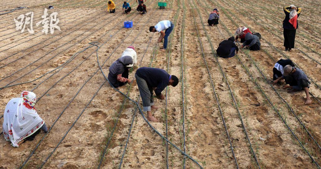在加沙中部代爾拜拉赫(Deir el Balah)一塊乾旱的農地上,一群巴人以耕種維生。自加沙市遷來的Abu Saad Shamlakh表示,因逃避戰火而來到這裏,租了一塊田,雖然缺水,但仍希望以耕種維生。另一名巴人Ismael Shamlakh則稱,已在此生活了約20天,惟只能居於帳篷內,沒有住所,而且當地每天也有炮擊轟炸,睡覺和工作時也感到害怕。(法新社)
