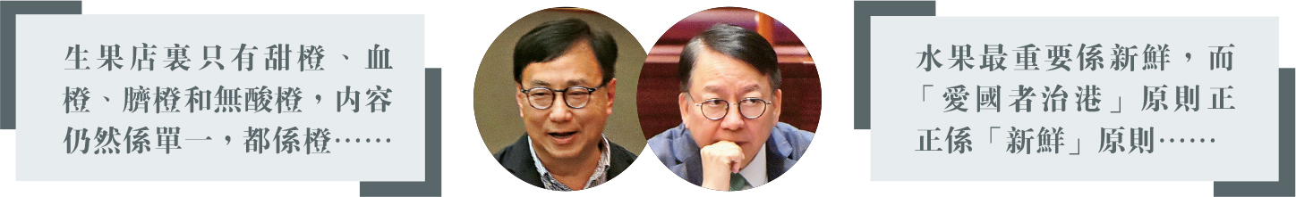【明報專訊】立法會一連三日辯論《施政報告》致謝議案,議員就唔同政策範疇發言。新思維狄志遠(左圖)就提到區議會選舉,其黨友無法取得足夠提名入閘參選,佢以橙嚟形容選舉,話「生果店裏只有甜橙、血橙、臍橙和無酸橙,內容仍然係單一,都係橙」,話所以選舉氣氛咁平淡。狄志遠希望生果店「有橙、有香蕉、西瓜,甚至榴槤」,咁樣先有多元選擇,能吸引更多顧客。政務司長陳國基(右圖)都用「生果論」反駁,話水果最重要係新鮮,而「愛國者治港」原則正正係「新鮮」原則,指如果無咗「新鮮」,市民食到嘅可能係「毒蘋果、腐爛嘅香蕉,甚至係已變壞嘅榴槤」。