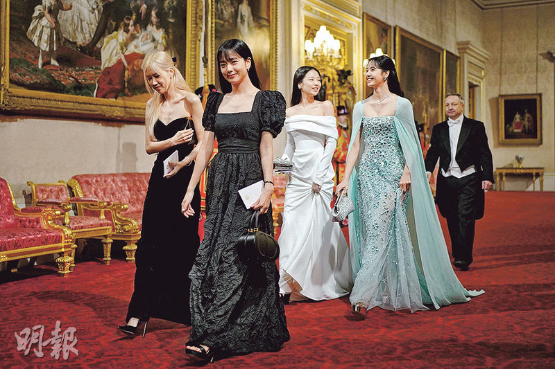 【明報專訊】韓國總統尹錫悅前日到英國展開國事訪問,晚上先偕妻金建希出席白金漢宮國宴,韓國女團Blackpink亦獲邀亮相,4名成員Jennie、Lisa、Rose和Jisoo盛裝打扮,並跟英王查理斯三世在宴會開始前閒談,氣氛輕鬆。尹錫悅疑借用曉格蘭特(Hugh Grant)在《真的戀愛了》扮演英揆的經典對白,「英國有披頭四、皇后樂隊、哈利波特、碧咸的右腳,韓國就有Blackpink、防彈少年團(BTS)、《魷魚遊戲》及孫興慜的右腳。」查理斯三世亦贊同韓國K-Pop文化「有令人着迷的非凡能力」,更點名稱讚Blackpink在全球傳達環境永續發展方面發揮重要作用,4名成員聞言即露出興奮又害羞表情。