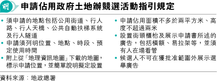 地政總署分三階段開放申請在政府土地辦競選活動,候選人需於每階段至少一周前遞交申請,按總署指引,候選人申請佔用的政府土地不得超過兩平方米、高度不得超過兩米(見表),但未列有罰則。身兼九龍城區議員的立法會議員楊永杰表示,現時指引行之有效,惟部分新人未必清楚相關規定,不過他認為,地政總署批出的街站範圍較狹窄。