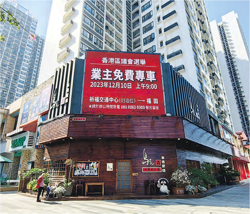 【明報專訊】特區政府近期為區議會選舉大力宣傳,建制政黨、社團亦不例外,而有大量港人居住、位於番禺的祈福新邨更將安排免費穿梭巴士,在區選投票當日(12月10日)接載內地港人到深圳福田,再返港投票。在祈福新邨內,近日由大廈大堂、戶外LED屏幕等各處都有大量香港區選宣傳品。據了解,祈福集團在本港及內地已舉辦多場動員大會,呼籲港人員工及其親友投票。