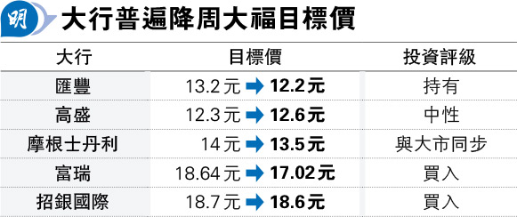 高盛因應周大福上半財年業績、較低營業額,以及營運開支改善,將集團2024至2026財年的純利預測下調1至3%。高盛又指出,相信公司即使面臨宏觀經濟挑戰及須控制折扣率,在珠寶業仍擁有龍頭地位,以及市佔率會穩健增長,不過由於近日金價大跌及消費力減弱,市場對黃金產品情緒降溫,對其復蘇步伐維持審慎。該行輕微上調周大福目標價由12.3元至12.6元,維持「中性」評級。