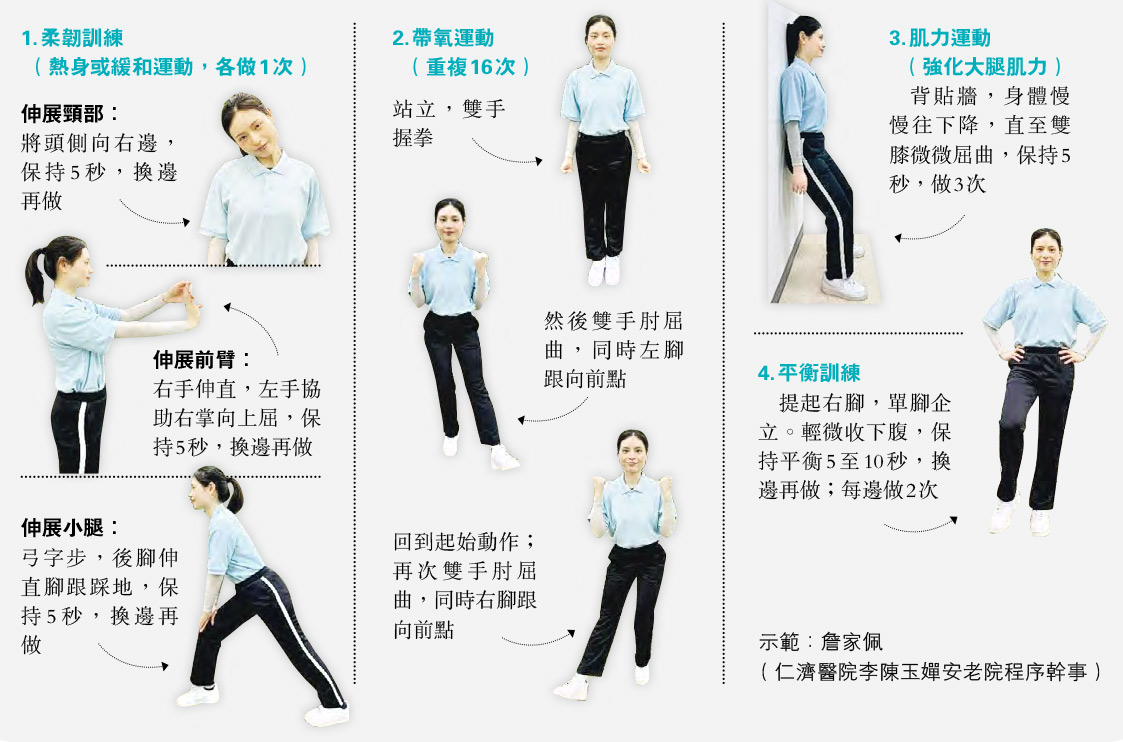 【明報專訊】世界衛生組織在2020年發布《身體活動和久坐行為的指南》,建議長者應定期運動,以促進身體健康。長者不妨跟着以下示範,齊齊動起來!
