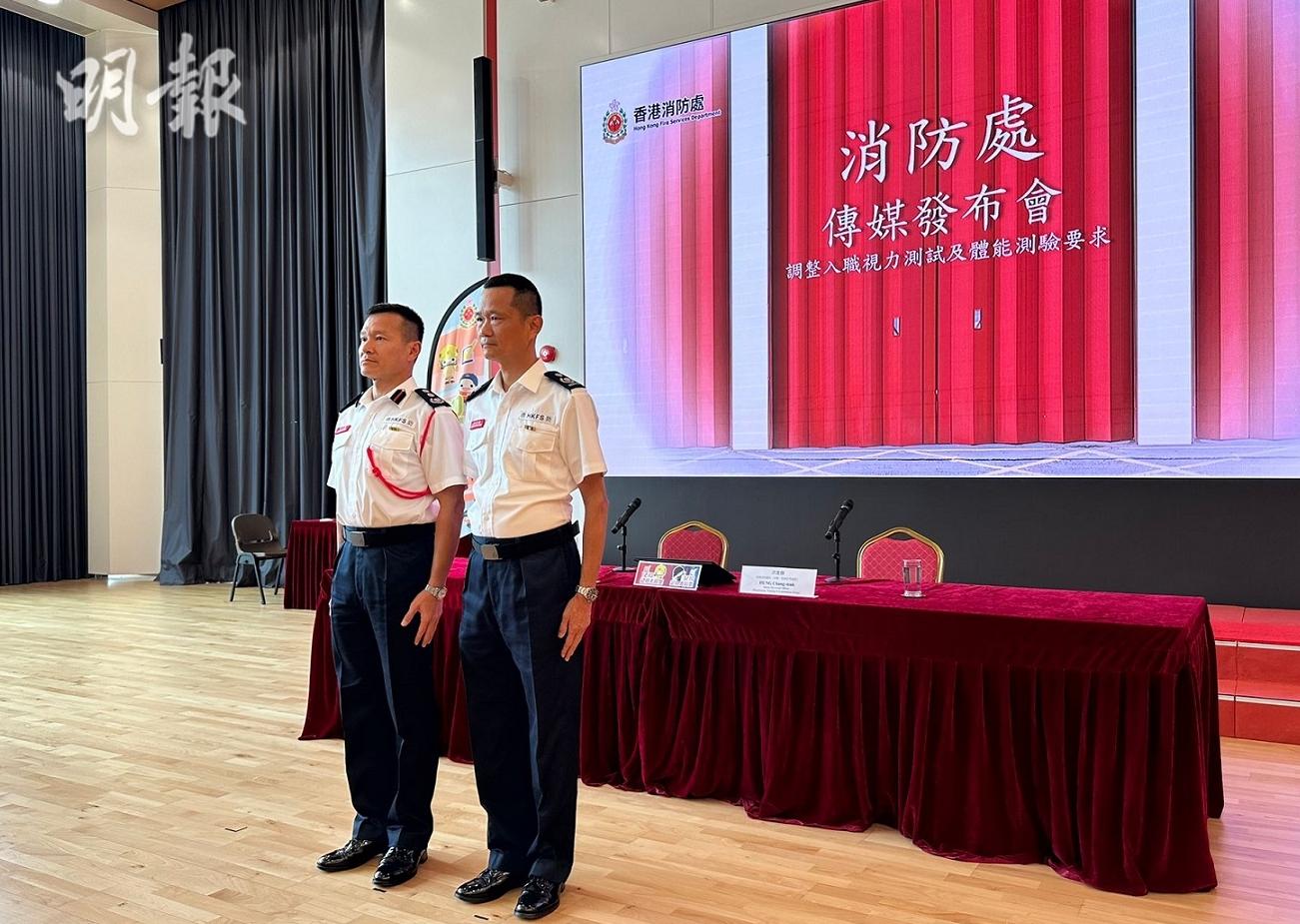 現時投考消防隊長須完成兩部分視力測試,包括在不戴眼鏡下,在6米的距離後以單眼指示視力測試圖第5行的字型方向,並用雙眼讀出第6行字型方向;經調整後,他們須在不戴眼鏡下,單眼指示第4行字型方向,並可以配戴眼鏡指示第6行的字型方向,必須通過兩部分方為合格。