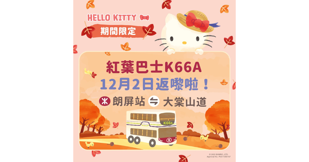 快到觀賞大棠紅葉季節,港鐵今年聯乘卡通角色Hello Kitty,安排Hello Kitty主題紅葉巴士K66A接載市民前往元朗大棠。K66A將於12月2日早上10時30分「首航」,其後的班次時間表暫未有公布。市民如欲前往大棠觀賞紅葉,宜同時留意康文署「賞花情報網站」(www.fa.gov.hk/zh/red-leaves.html#blossoming)的紅葉情報。