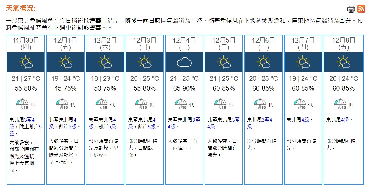 即時熱點 天氣|天文台:大致多雲最高27°C 今晚天氣稍涼 (08:37) 發佈於 2 年 前 2023 年 11 月 30 日 By 明報 上午8時10分,天文台錄得23.4°C,相對濕度70%。廣東北部的氣壓正在上升,預料一股東北季候風會在今日(11月30日)稍後抵達華南沿岸。本港地區今日大致多雲,日間部分時間有陽光及溫暖,最高氣溫約27°C。吹和緩東北風,今晚離岸風勢清勁,天氣稍涼。展望未來一兩日氣溫稍為下降。早上市區最低氣溫約18°C左右,新界再低幾度。(天文台) 相關文章:天文台天氣天氣速遞編輯推介 Up Next 天氣|天文台:周五早上稍涼 市區最低19℃ (21:00) 不要錯過 Google 12月1日開始刪除「閒置帳戶」 7招保帳戶 (08:57) 繼續閱讀 贊助商 猜你喜歡 天氣|天文台:周日早上市區最低14℃ 部分地區寒冷 (17:55) 天氣|天文台:多雲有幾陣雨 今晚轉涼降至約17℃ (09:25) 【Emily】天文台「矚目天氣及氣候事件選舉」 投票有機會獲紀念品 天氣|天文台:周六多雲有雨 晚上轉涼氣溫17至21°C 下周日跌至最低14°C (21:22) 天氣|天文台:短暫時間有陽光 最高19°C (08:24) 天氣|天文台:周四多雲早晚有微雨 氣溫介乎17至20°C (20:57)