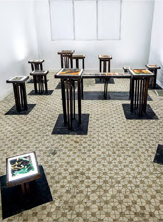 「待在一旁的肖像」由兩組作品組成。當中,《墜落泥土的肖像》為多個木台,木台上放着纖維粗粗的紙,紙上有些朦朧不清的圖案。沒有太多文字介紹,有時看作品就是如此有趣,你要像查案般,留意作品的素材、形勢、擺放、製作方法等藝術處理,猜想創作者的所思所想。紙張質地散發一種殘舊的感覺,又像是許多張影像疊在一起,種種都提示着有關時間的流逝。作品名字讓人進一步思考,有什麼會「墜落泥土」呢?可能是人類、動物、凋謝的花或植物,均意味着死亡和消逝。
