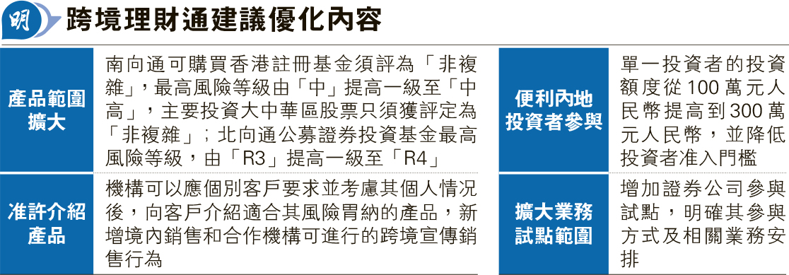 產品方面,建議新制下,南向通與北向通投資者可投資範圍亦有所擴大(詳見表),並新增境內銷售機構和合作機構,可進行跨境銷售行為。