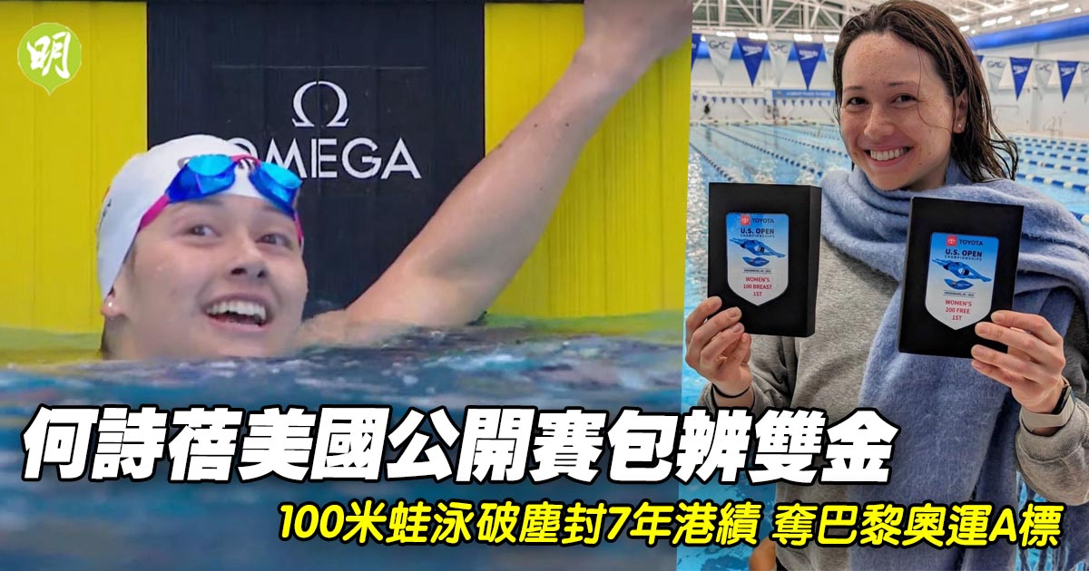 美國游泳公開賽今(2日)續於美國北卡羅來納上演,香港「女飛魚」何詩蓓(Siobhan)在主項200米自由泳游出破賽會紀錄的1分54.20秒,力壓莉迪姬等勁敵封后;她短休不足半小時,即轉戰非強項100米蛙泳,更游出達巴黎奧運A標的1分06.05秒,打破塵封7年的港績再奪一冠。