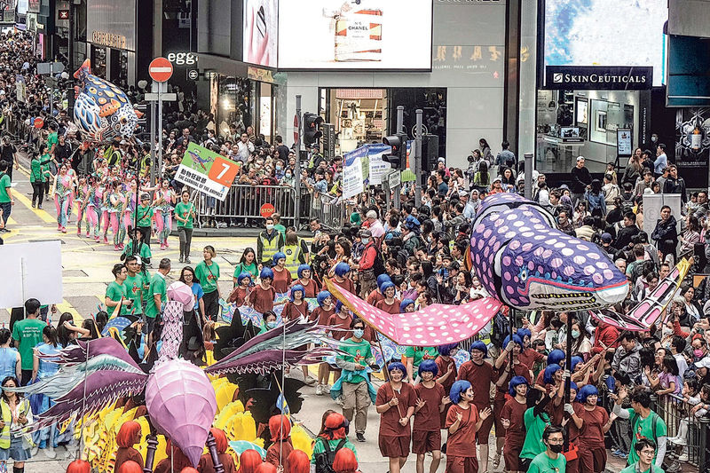 【明報專訊】銅鑼灣維園及崇光百貨外噚日重現久違嘅公眾遊行活動,「渣打藝趣嘉年華2023」下晝喺銅鑼灣舉行壓軸巡遊,以法國作曲家聖桑作品《動物狂歡節》為主題,製作咗10座約4米高嘅巨型木偶,包括猩猩、北極熊、雀仔等造型。200間本地學校嘅400個學生,聯同5組專業舞蹈員組成巡遊隊伍,部分人著住色彩繽紛嘅衫扮唔同動物。巡遊隊伍由維園中央草坪出發,途經記利佐治街,至東角道折返,有警員喺巡遊路段駐守維持秩序,沿途大批市民圍觀,有圍觀者戴住動物頭套,見小朋友面上有彩繪,睇到木偶時表現雀躍。警方下晝喺巡遊路線一帶實施特別交通安排,約4點半解封。