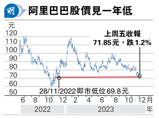 阿里巴巴於今年3月時宣布有史以來最大規模「1+6+N」重組計劃後,陸續有旗下公司計劃上市,惟過程不順。由於美國擴大晶片出口限制,阿里於本月季績公布決定不再推動阿里雲全面分拆,盒馬的IPO計劃亦已暫停。現在集團旗下菜鳥申請香港IPO,並遞交申請文件,阿里國際數字商業集團正在為外部融資做準備。自擱置阿里雲及盒馬IPO計劃以來,阿里巴巴股價不斷尋底,上周五低見71.85元再見一年新低(見圖),市值更遭另一中概電商股拼多多(美:PDD)超越。