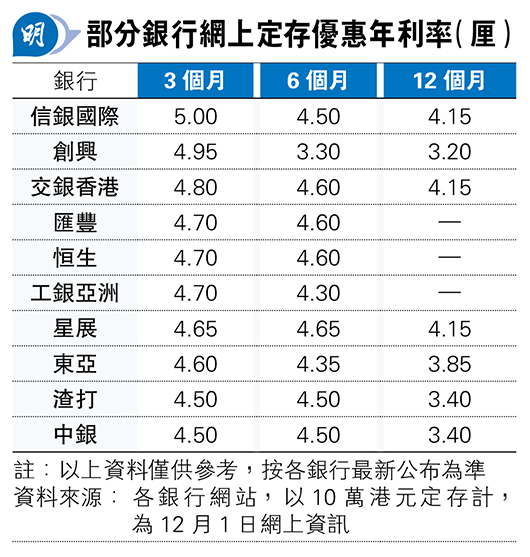 若然只敘造定存3個月或6個月,獲得的年息率大多可逾4.5厘,個別更達5厘;如在信銀國際經網上理財服務,以新資金10萬港元或以上開立定存,敘造3個月,年利率達5厘。