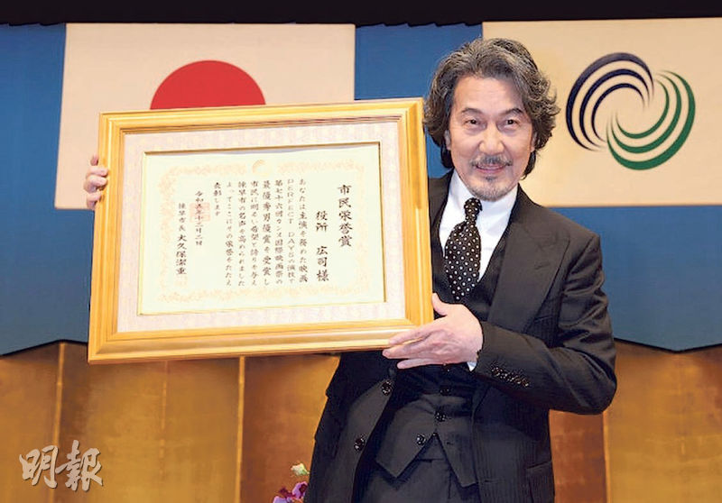 【明報專訊】憑雲溫達斯(Win Wenders)執導《新活日常》贏得康城影帝的日本男星役所廣司,得獎後驛馬星動,10月來港出席亞洲電影節的大師班活動,上月再到台灣擔任金馬獎頒獎嘉賓,前日終於返回出生地長崎縣諫早市,從市長手上接過榮譽市民獎狀,成為繼日本男子體操奧運金牌選手內村航平後,第二位獲此殊榮的諫早市民,難怪役所領獎時神情略見緊張,「能夠成為榮譽市民,簡直令我不敢相信」。他自爆入行之初,曾經考慮以「諫早廣司」作藝名,藉以紀念家鄉。