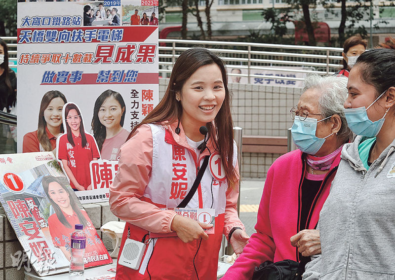 工聯會候選人陳安妮2019年敗給競逐連任的民主黨許祺祥,她表示,今次參選需分配較多時間在「白區」拉票,即過往沒有或較少服務的地區,「大約六四比」。她說,過往都有透過流動街站、活動等與街坊接觸。問到有否考慮爭取民主派或中間派選民的支持,她僅稱,相信市民會見到其所屬政團的工作,「做好本分」以政績爭取支持。葵涌西民建聯候選人黃俊揚表示,因日程緊湊而未能受訪。