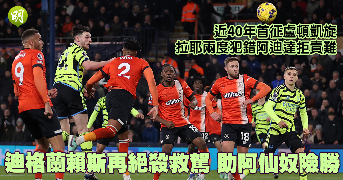 迪格蘭賴斯今晨(6日)第2次在今季英超補時建功,令阿仙奴以4:3絕殺盧頓,接近40年來首次作客該支「升班馬」凱旋,賽後15戰得36分,暫將領前明晨才征戰錫菲聯的次席球隊利物浦5分。「兵工廠」門將大衛拉耶此役兩度犯錯失球,但領隊阿迪達稱「我們須以團隊方式一起做好防守」,來淡化愛將差點令球隊失分的責任。