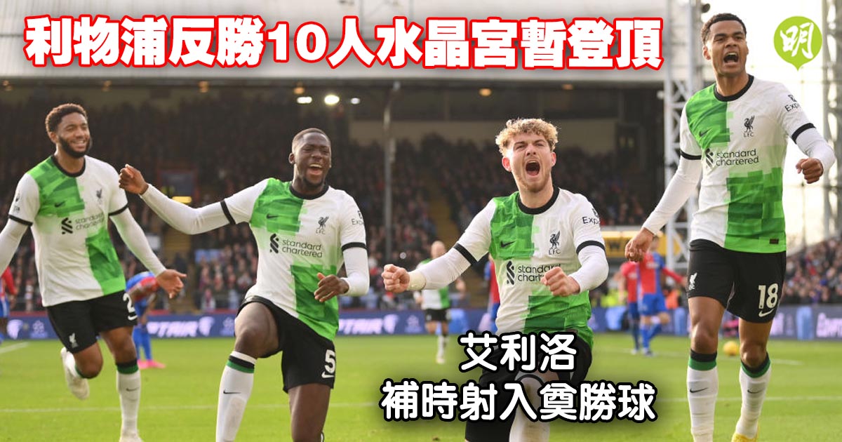 利物浦今晚(9日)於英超早場作客憑穆罕默德沙拿及哈維艾利洛各建一功,以2:1反勝末段踢少一人的水晶宮,各項賽事四連捷,賽後16戰得37分,暫以1分壓過稍後凌晨作客阿士東維拉的阿仙奴升上榜首。