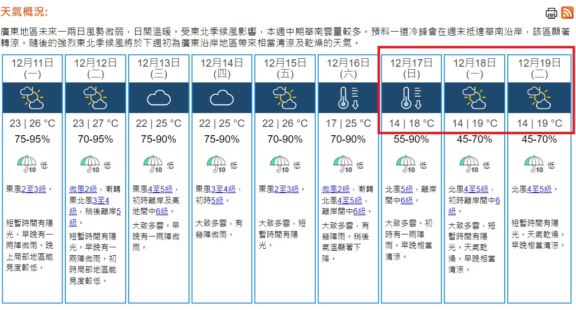 即時熱點 天氣|天文台:12月17-19日市區氣溫料跌至14°C (15:45) 發佈於 2 年 前 2023 年 12 月 10 日 By 明報 【15:45】根據天文台九天天氣預報,12月17日至19日市區氣溫估計會跌至14°C。冷鋒將於周末抵達華南沿岸,隨後的強烈東北季候風將於下周初為廣東沿岸地區帶來相當清涼及乾燥天氣。 【08:45】上午8時30分,天文台錄得23.3°C,相對濕度81%。一股偏東氣流正影響廣東沿岸。同時,覆蓋該區的雲帶稍為轉薄。本港地區今日(10日)短暫時間有陽光,最高氣溫約26度。吹和緩偏東風。展望未來一兩日大致多雲,日間溫暖。本周中期風勢較大。周末期間氣溫顯著下降,隨後數日天氣清涼。(天文台) 相關文章:天文台天氣天氣速遞編輯推介 Up Next 加沙一隅.短片:加沙巴人包圍物資車隊圖搶掠 護送人員開槍示警驅趕 (13:50) 不要錯過 天氣|天文台:多雲有微雨 未來兩三日較潮濕溫暖 (10:04) 繼續閱讀 贊助商 猜你喜歡 天氣|天文台:周一早上市區氣溫料22°C 周四降至20°C (19:02) 天氣|天文台:今日乾燥部分時間有陽光 市區最高氣溫27°C (09:09) 天氣|天文台:日間最高28°C 吹和緩北至東北風 (09:31) 天氣|天文台:周日多雲日間乾燥 氣溫24至30°C (20:01) 短片:樺加沙一個月後 重災區將軍澳海濱未復常、富麗敦海洋公園酒店大門復修中 (08:59) 天文台:今日沿岸水位高0.5至1米 晚上漲潮部分沿岸低窪地區或輕微水浸 (08:35)