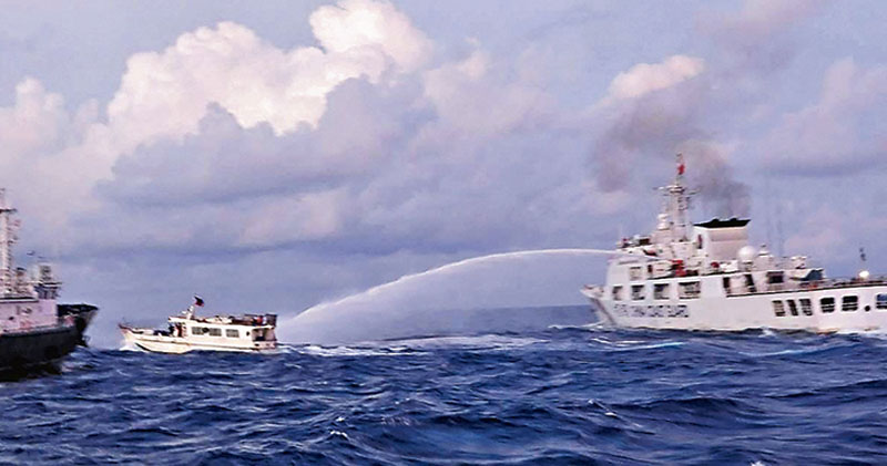 【明報專訊】中菲連續兩日在南海爭議海域發生衝突。菲海岸警衛隊昨(10日)發布現場短片顯示中國海警船向其補給船發射水炮,並撞擊其中一船,菲方稱導致該船引擎「嚴重損壞」。中國海警局昨發布通告稱,菲律賓4艘公務和運補船非法闖入仁愛礁鄰近海域,其中菲「尤娜扎·五月」1號艇(Unaizah Mae 1 )故意衝撞中方海警船並導致刮蹭,中方對該運送必要生活物資船艇作出「臨時性特殊安排」。