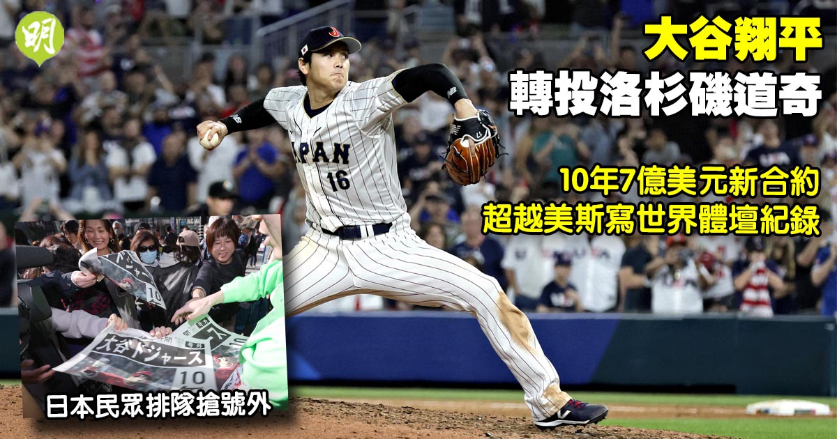 日本棒球巨星大谷翔平今(10日)宣布,新球季將由美國職棒大聯盟(MLB)球隊洛杉磯天使轉投同市勁旅洛杉磯道奇,並簽下一紙10年總值7億美元(約55億港元),超越足壇球王美斯此前保持的紀錄,成為世界體壇史上最貴合約。消息震撼日本,當地有主流報章派發相關新聞的號外,吸引大批民眾排隊取閱。