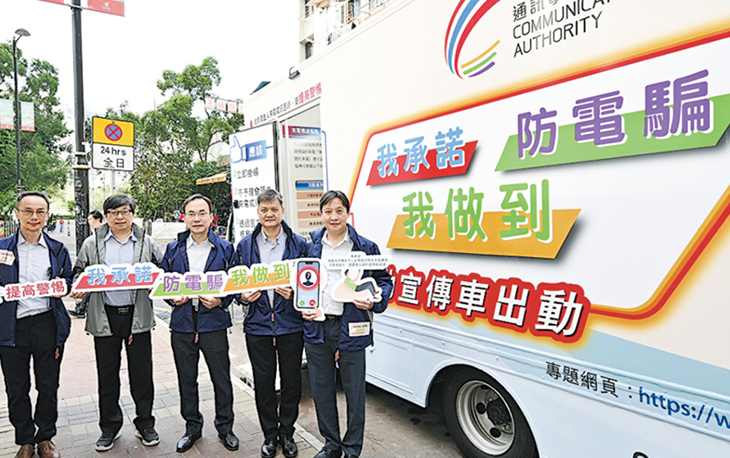 【明報專訊】電話騙案猖獗,通訊事務管理局都話幫手宣傳,噚日起展開「我承諾 防電騙 我做到」為主題嘅流動宣傳車活動,安排宣傳車即日起至12月12日巡迴到訪18區,透過遊戲和展覽,加強向市民推廣提防電騙信息。