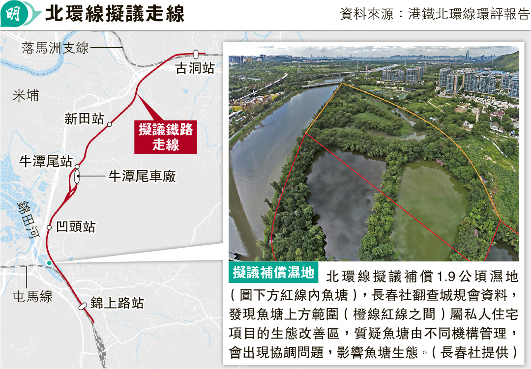 【明報專訊】全長約10.7公里的北環線項目預料2025年動工,港鐵就該項目向環保署提交的環評報告顯示,北環線採用地下走線方案,減少佔用地面,避免影響沿線濕地及魚塘。根據報告,項目會影響合共3.23公頃濕地,預計需補償約1公頃濕地,並已識別約1.9公頃位置作為潛在的補償濕地。長春社指出,擬議補償濕地的地點位於數個正運作的魚塘,本具生態價值,擔心進行補償工程期間令魚塘停運,變相成荒廢魚塘,令生態價值下降,且擬議補償範圍僅佔部分魚塘,餘下部分屬附近私人住宅項目範圍,日後魚塘將被分割管理,做法不理想。