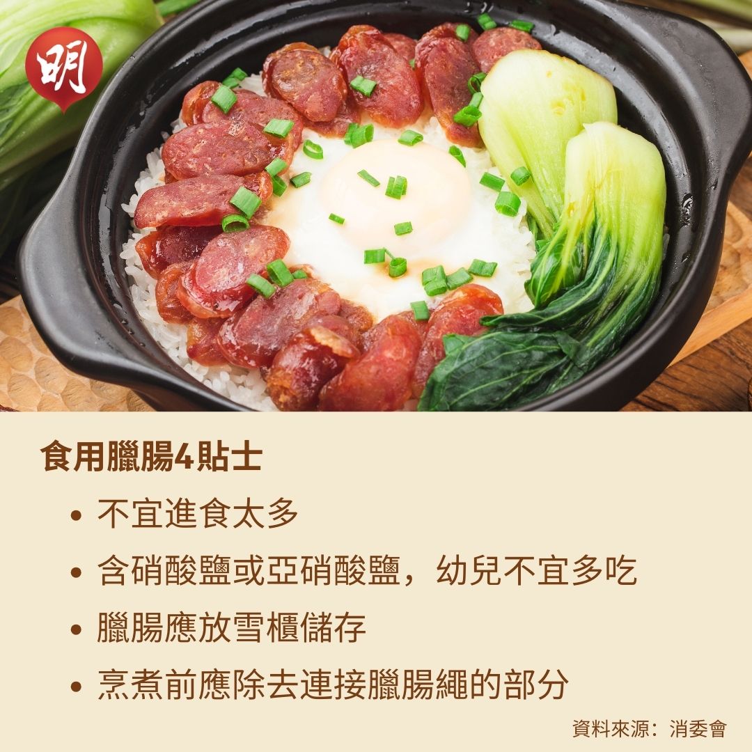 秋冬食煲仔飯,臘腸是不可或缺食材,但消委會測試市面30款臘腸後,指出全部樣本屬高鈉、除一款外全部均屬高脂,逾八成屬高糖(相關報道:臘腸高鈉高脂高糖 6款檢出禁用染色料 消委會籲適量進食)。消委會又解構臘腸煲仔飯,提醒食一煲的熱量為1072千卡,達成年人全日所需的54%(按每日需要2000千卡計算);鈉含量2928毫克更是超出每日上限的46%(世界衛生組織的建議,一般成人每日的鈉攝取量應少於2000毫克)。