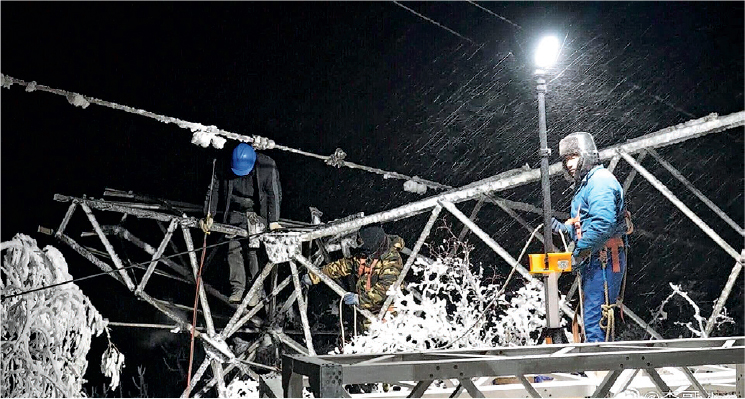 山西新聞網報道,被壓斷的電纜位於1700米海拔山嶺,由於道路被凍雨中斷,逾百維修人員要抬電纜和設備上山接駁,並爬上電塔人手敲打除冰,山上氣溫零下15℃。