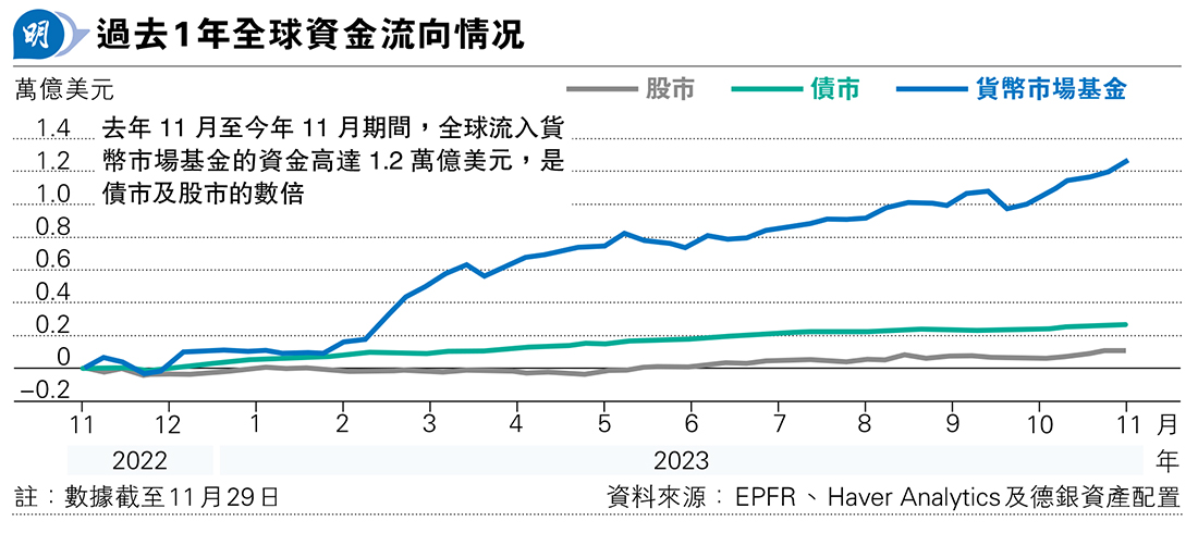 高騰國際資產管理黃冠豪則引述EPFR、Haver Analytics及德銀資產配置統計的另一組數據,指從去年11月至今年11月期間,全球流入貨幣基金的資金高達1.2萬億美元,是債市及股市的數倍(見圖),可見過去一年美息在更長時間維持在更高水平(Higher for Longer)的情况下,回報跟隨美息上升的貨幣基金吸金能力之強。