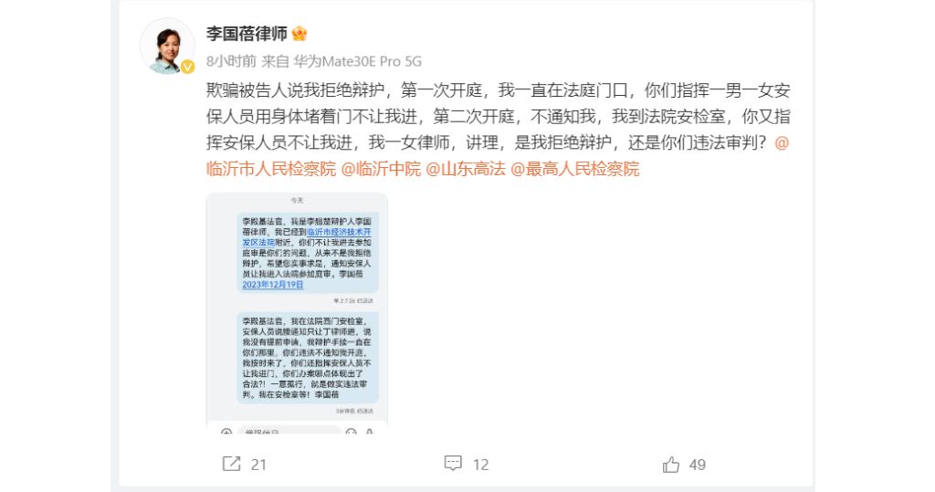 北京必奕律師事務所主任李國蓓在微博發文,並貼出發給法官的兩條短信,第一條發送於上午7時半,表示她當時已經到達臨沂市經濟技術開發區法院附近,希望對方通知保安人員讓自己進入法院參加庭審。第二條她表示已在法院西門安檢室等候,但保安人員說「接通知只讓丁律師進」。