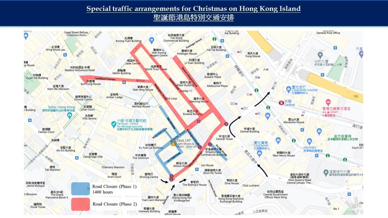 至於港島方面,平安夜當日下午2時至翌日上午5時,蘭桂坊一帶道路,包括蘭桂坊、介乎雲咸街與威靈頓街的德己立街、安蘭街和威靈頓街等將會封閉。而視乎人流,警方或會在一段士丹利街、雲咸街、德己立街、威靈頓街及閣麟街等,擴大封路範圍。