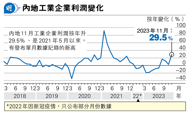 11月利潤按年增速創2021年5月以來新高,不過內企盈利在疫情防控期間受影響,當局去年3月、以及7月後暫停公布單月數據,至今年才再度公布。