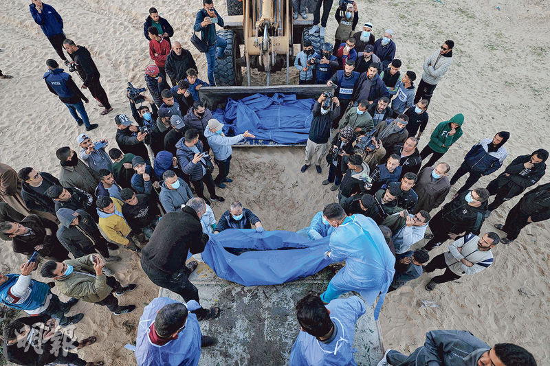 以軍近期攻勢南移,圖為以軍周二發還逾80具近月在加沙北部遇害及被以軍帶走的巴人遺體,由貨櫃送到南部拉法卸下後準備埋葬。