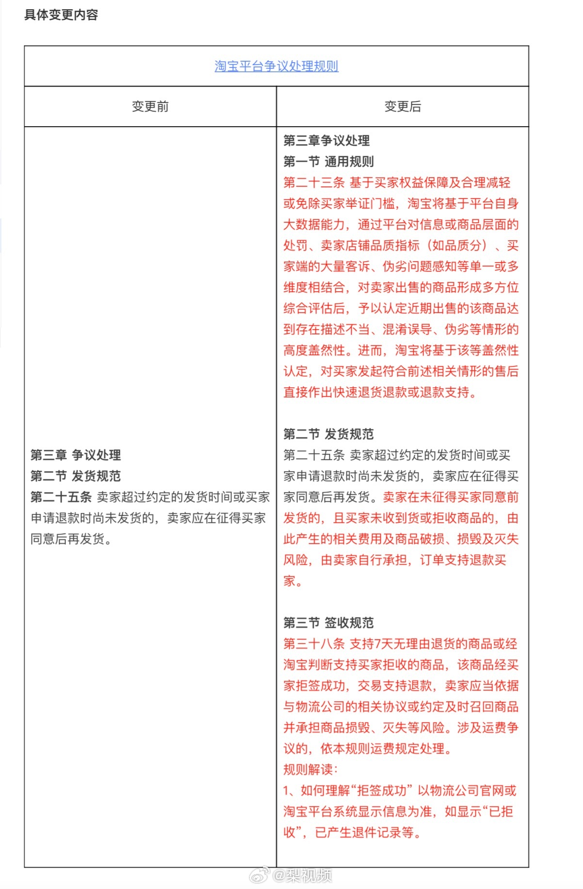 淘寶此前的「7天無理由退換」被指不及其他網購平台方便,退貨還要墊付運費。新規則下,淘寶表示,基於平台自身大數據能力,識別多維度結合,對於買家發起符合相關情形的售後,做出快速退款或退貨退款的規定。淘寶同時提供商家快捷申訴通道,如果遭遇不合理的快速退款申請,可以進行申訴。