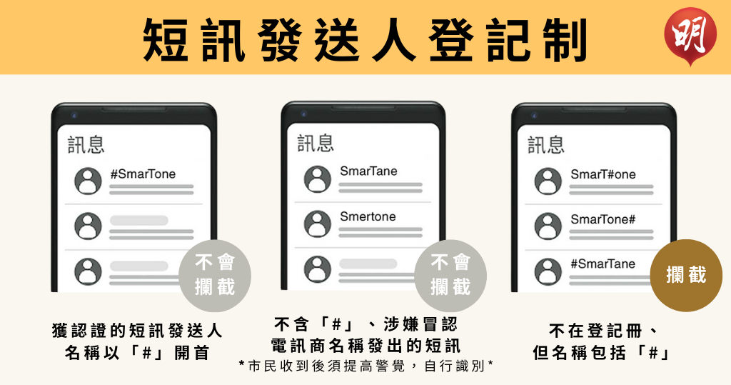 所有以「#」開首的SMS發送人名稱均已獲認證,並會列在通訊局登記冊名單上,讓市民查核;無「#」開首的發送人名稱即未經認證,由市民自行判斷對方身分。通訊辦提醒,收到陌生短訊時不應披露個人資料。