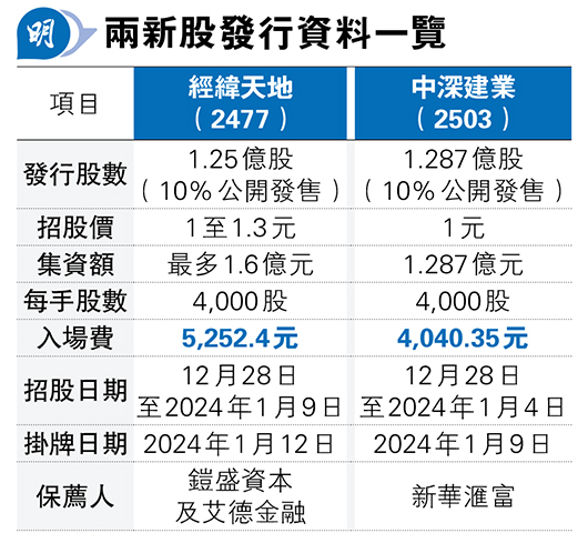 另一新股經緯天地的招股期較長,由昨起至2024年1月9日招股,計劃發行近1.3億元,當中一成於香港作公開發售,招股價介乎1元至1.3元,集資最多1.6億元。該股每手4000股,一手入場費約5252.4元,料於2024年1月12日掛牌,聯席保薦人為鎧盛資本及艾德金融。