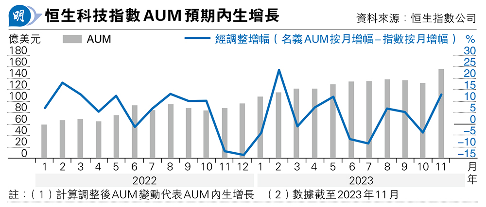 受惠美聯儲政策轉向和AUM資金流入勢頭增長,使用調整後的AUM 變動(名義AUM按月變動–指數按月變動)代表AUM內生增長計算,恒生科指實際上在11月錄得AUM強勁流入,按月實際增長14%。恒生科指今年首11個月累跌5.5%,調整後AUM期間實際大增近67%。