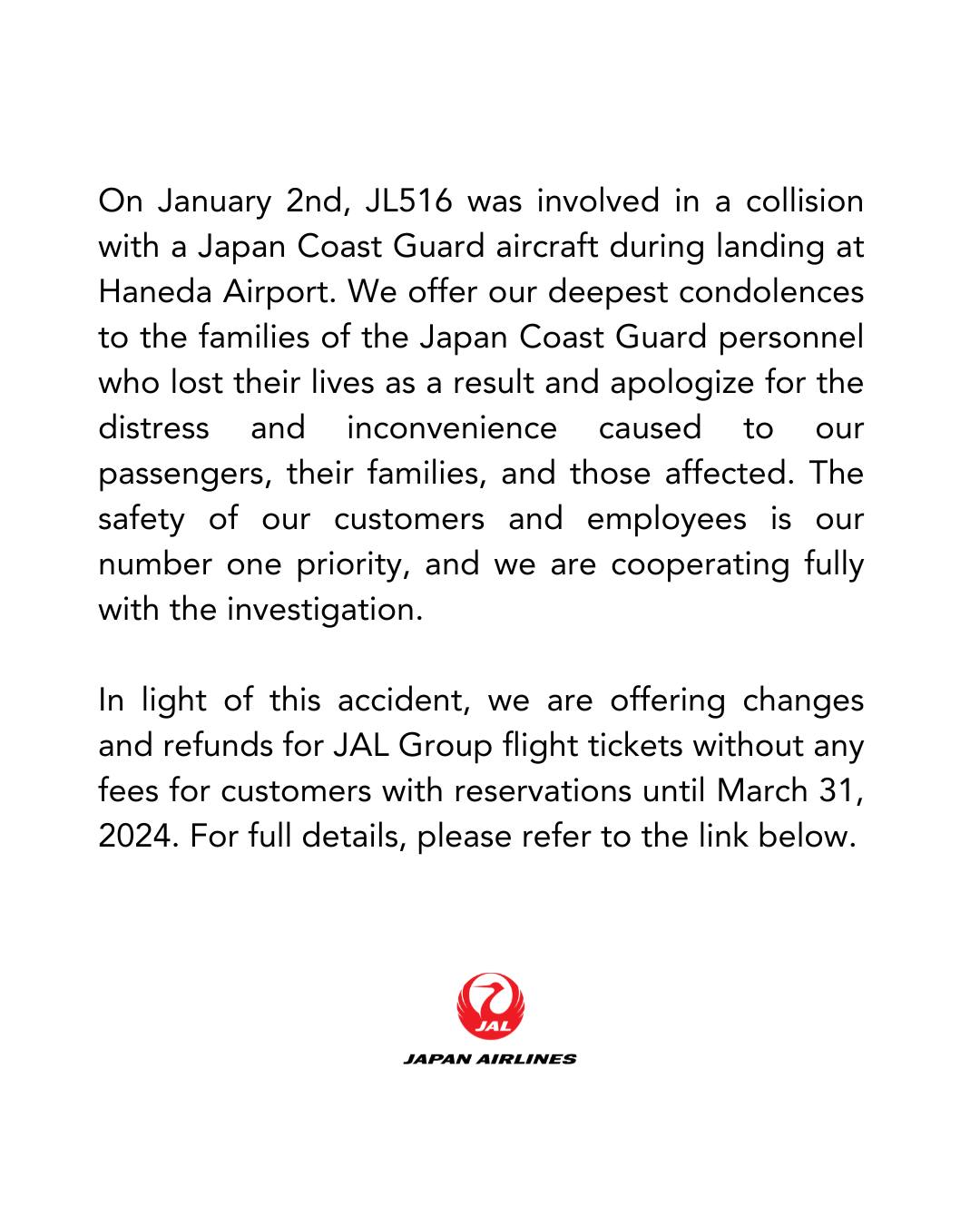 即時港聞 日航免費為3月底前出發旅客更改機票及退款 (12:19) 發佈於 2 年 前 2024 年 1 月 3 日 By 明報 日航客機昨天(2日)傍晚降落東京羽田機場後,在跑道上與海上保安廳飛機相撞,客機起火焚燒。羽田機場今日(3日)取消約100班航班。日航公布,如旅客持有於今年3月31日或之前起飛的日航機票,均可免手續費更改機票或退款服務,相關申請可於本月31日之前提出。 日航指,對海上保安廳飛機上的死者家屬表達深切哀悼,並向事故中受影響人士致歉,日航正全力配合調查。 相關文章:日航編輯推介羽田機場 Up Next 海關檢950萬元走私燕窩拘一司機 歷來陸路最高價 (16:31) 不要錯過 陳國基:應對內地客滯留事件「經一事長一智」 日後辦大型活動前召統籌會議 (16:44) 繼續閱讀 贊助商 猜你喜歡 日航機長違規飲酒 社長等37人被罰減薪 (21:30) 東京羽田機場保安員涉偷錢被捕 供稱多次犯案偷150萬日圓 (20:00) 機長夏威夷違規飲酒 日航遭國土交通省發警告 4高風險機師停職 (19:07) 東京羽田機場附近火警 部分航班延誤 (19:30) 日航客機降落羽田機場爆胎 機上60乘客無受傷 (10:34) 日航系統一度遭網絡攻擊 (14:17)