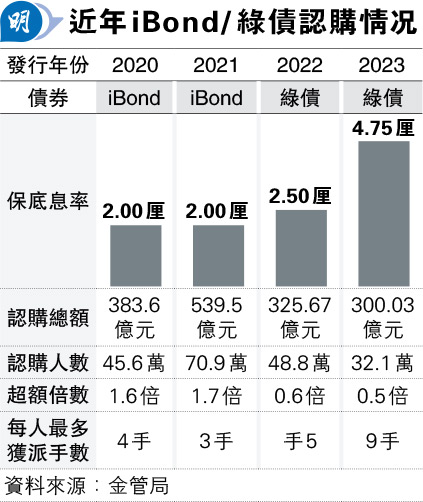 去年底市場對美國今年減息預期更為肯定,帶動反映銀行資金成本的3個月港元拆息,由去年10月時的5厘水平,降至昨日的4.18厘,有助降低機構發債成本。但銀行早前年結以高息鎖定了不少定存資金,加上農曆新年資金需求或再推高港元拆息,影響零售債需求。政府去年9月發售的零售綠債,息率高達4.75厘,認購反應反為是近年最差(見圖),分析相信正是由於不少散戶資金敘做了定存。李沛鏗表示,當局每年按自身資金需求考慮發債,未必能百分百把握最好時機。