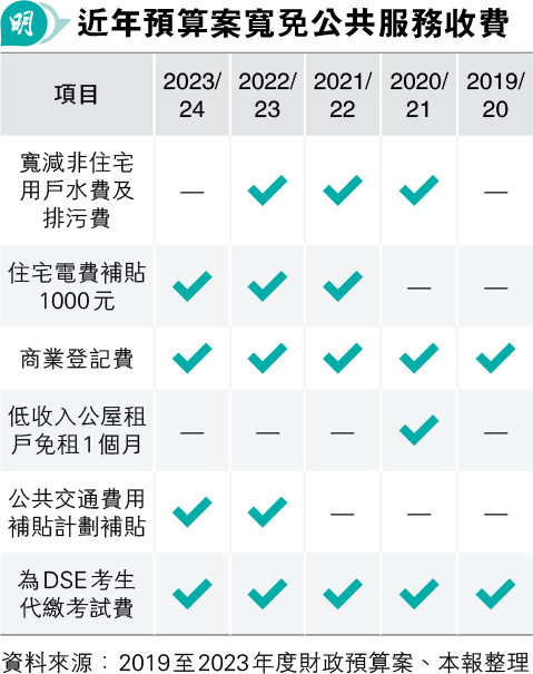 陳茂波在網誌未點名具體公共服務收費。在各公共服務中,水費對上一次調整是1995年初,政府2014年曾提出檢討水費,最終未成事。翻查資料,陳茂波過去預算案寬減措施中,2020/21至2022/23年度曾寬減非住宅用戶75%水費及排污費,以22/23年度計每戶每月上限分別2萬及1.25萬元,政府收入減少6.8億元。