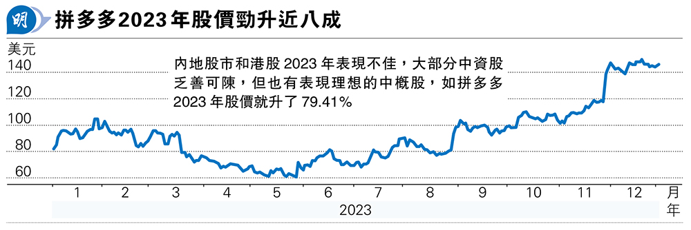 晉達資產管理馬文暢管理的「晉達全方位中國股票基金」,投資包括中國A股、B股、H股及美國預託證券等在不同市場掛牌的中國股票,可增加捕捉最佳投資的機會,且較能代表中國的經濟情况。根據晉達資產管理網站資料,該基金2023年回報為-11.78%,與基準指數MSCI中國淨總回報指數(MSCI China All Shares Net Return Index)相若,亮點是10大持股(見表1)中拼多多(美:PDD)在2023年股價勁升79.41%(見圖),而中石油(0857)、濰柴動力(2338)及紫金(2899)股價其內亦分別上升44.54%、24.43%及20.23%。
