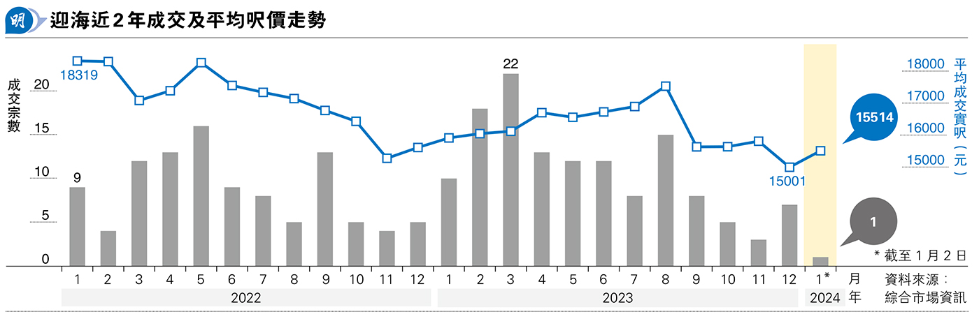 【明報專訊】新年伊始,多個二手屋苑均錄得2024年首宗二手買賣成交;截至1月2日止,馬鞍山指標屋苑迎海,錄得一宗海景3房戶成交,而屋苑去年12月受惠於減辣後市場氣氛回暖,錄約7宗二手買賣成交,但因買家入市態度仍審慎,成交價未見顯著反彈,均呎亦於1.5萬元水平徘徊。
