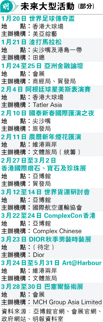 本港未來數個月將舉行多項大型活動,涵蓋經濟、體育及文藝範疇,包括本月底亞洲金融論壇、下月阿根廷球星美斯將來港參加表演賽。繼去年11月的法國品牌LOUIS VUITTON後,另一法國品牌DIOR將於3月來港舉行時裝展。自2016年起每年在美國舉辦的流行文化活動ComplexCon,同月亦於本港舉行,屬首次「登陸」亞洲。其香港發言人早前稱,本港一直是全球城市文化的核心平台,很高興把活動帶到香港,將邀請頂級設計師、藝術家及創作人參與,冀吸引逾3萬名全球訪客來港。