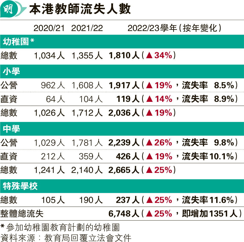 【明報專訊】學界教師流失加劇。教育局昨日回覆立法會議員的文件顯示,全港學校近3個學年的教師流失人數連年增加,上學年(2022/23)幼稚園、中小學和特殊學校共流失6748名教師,按年多1351人,升幅達25%。教育局長蔡若蓮昨稱,當局每年檢視教師供應及學校實際情况,目前數字反映教師供應量「非常充裕」。津貼小學議會主席蘇炳輝指出,較資深的中層教師流失,導致不少學校「都在喊救命」,建議局方增加資源,助教師聚焦教學。