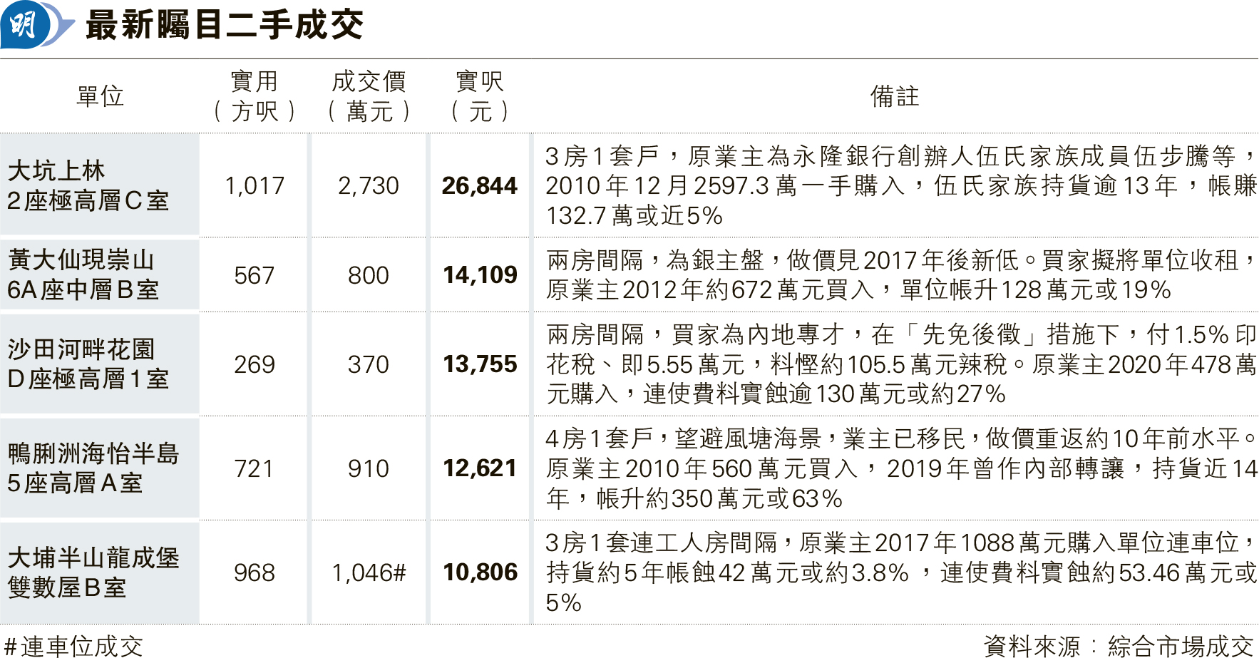 大埔半山龍成堡亦錄二手蝕讓,美聯高級營業經理彭曉君表示,屋苑雙數屋B室,實用面積968方呎,3房1套連工人房間隔,連一個車位,早前以1128萬元放售,議價82萬元或7.2%,最終以1046萬元易手,實呎10,806元。原業主2017年1088萬元購入單位連車位,持貨約5年,連使費料實蝕約53.46萬元或5%。